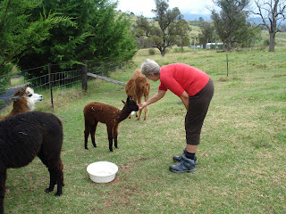 The boys were also bribed to come and greet us at the fence, but their paddock has the best view. They were all due to be shorn on Monday, but because of the rain has been postponed until later in the week. Lucky for us, because we got to see their beautiful coats , they are lovingly looked after and it shows. Margaret told us the commercial alpaca people aren't interested in the fleece because it's not white, but local people buy them to spin and make beautiful garments from their various natural colours, skilfully making patterns from the various shades. The alpacas are good at getting rid of the weeds and keeping the grass down, and we are told make excellent guardians for chickens. Maybe alpacas are in our future too?